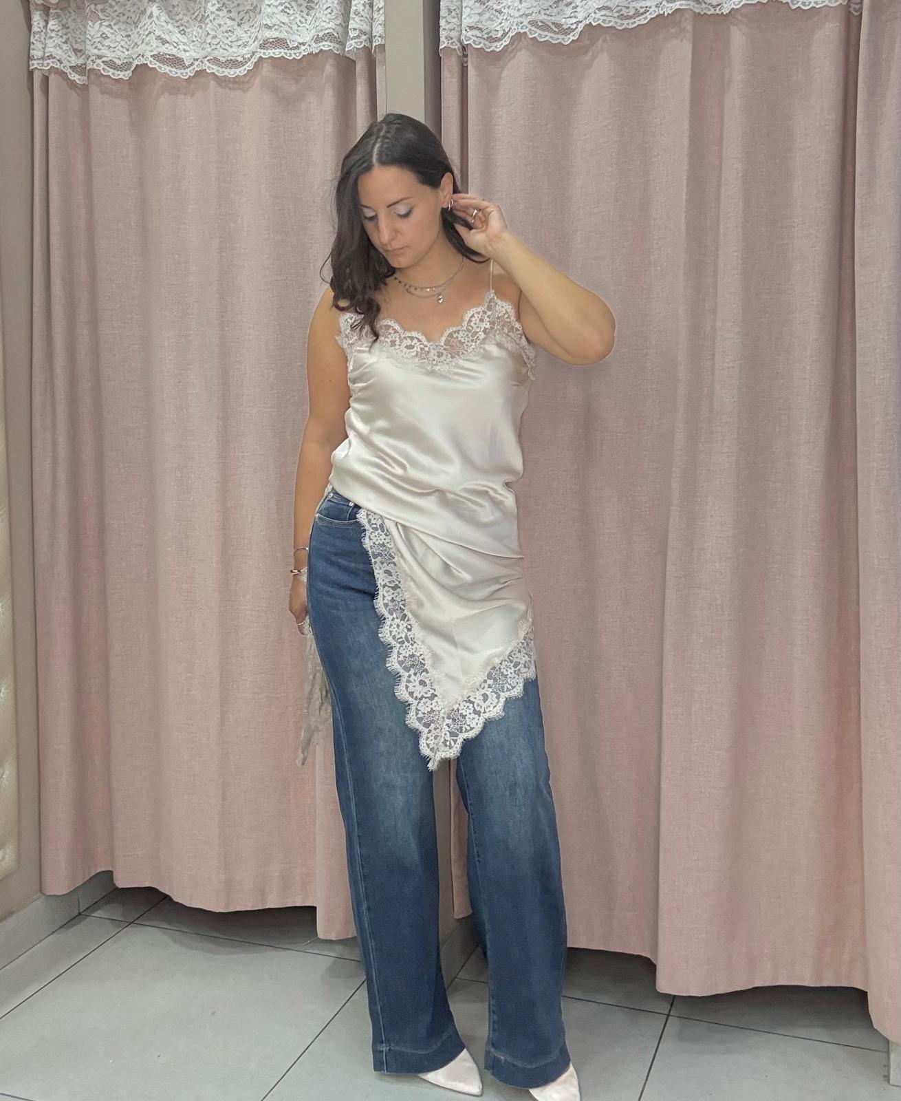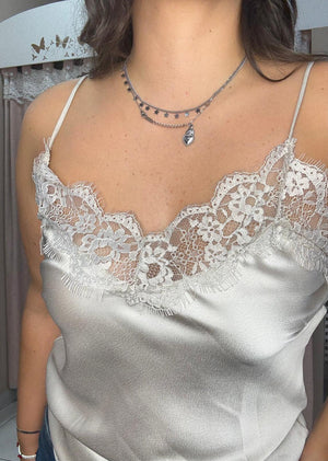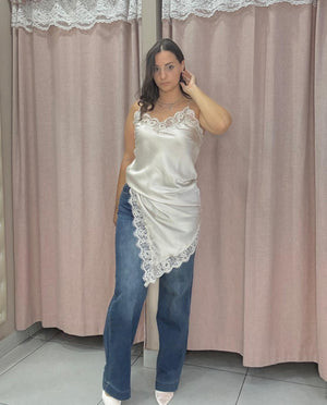 Top/vestito in raso a bretelline con dettagli in pizzo sullo scollo