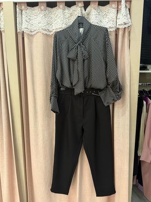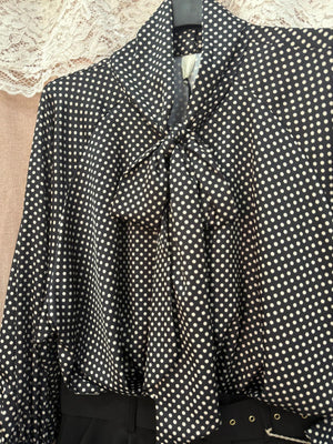 Blusa in fantasia pois, con collette e mega fiocco al collo regolabile, bottoni frontali su tutta la lunghezza e sui polsini