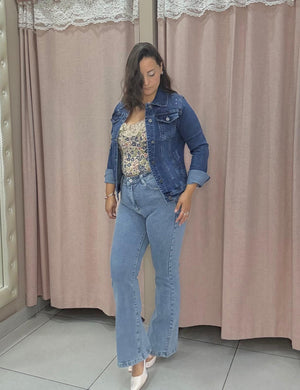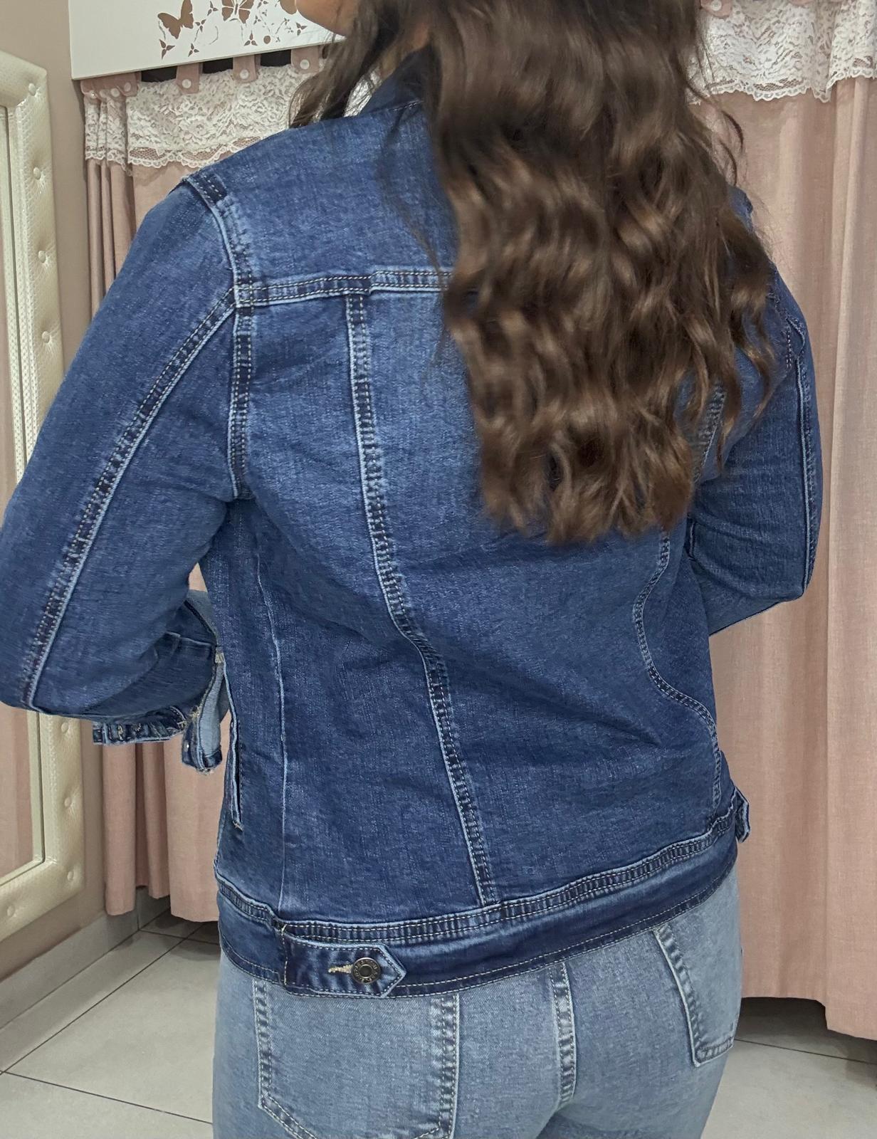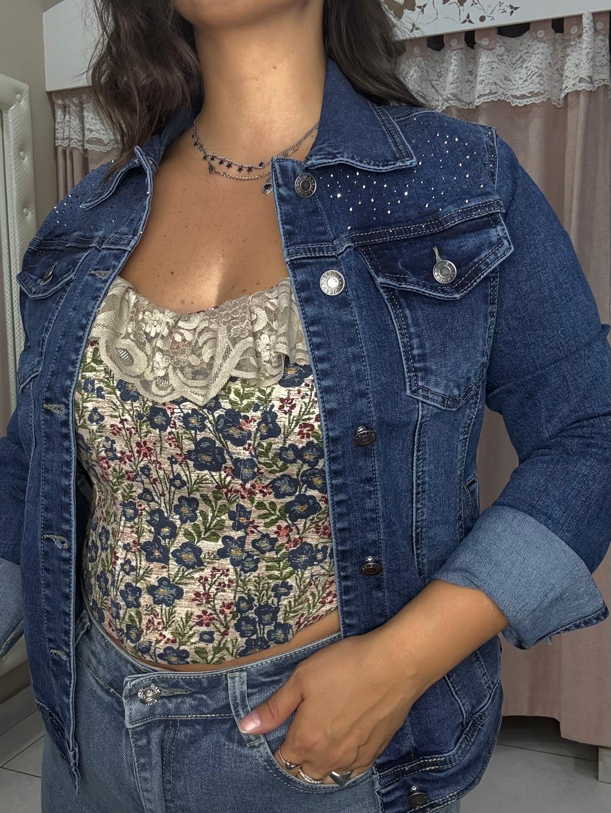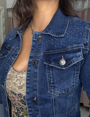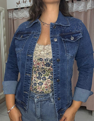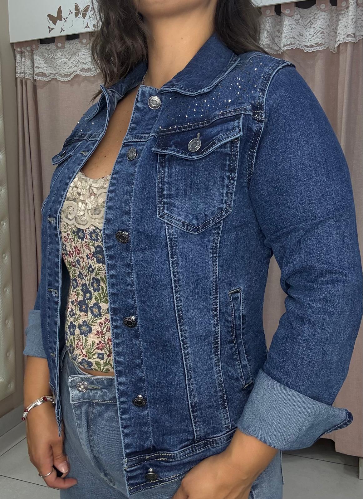 Giubbino in jeans con applicazioni di brillantini sul petto e tasche sul davanti e vere tasche laterali