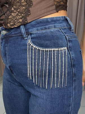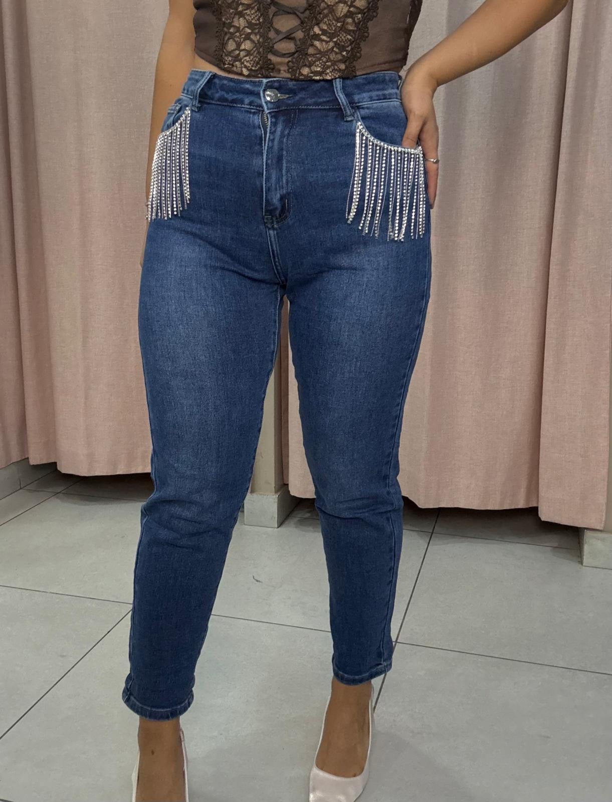 Jeans vita alta, con dettaglio di brillantini pendenti sulle tasche