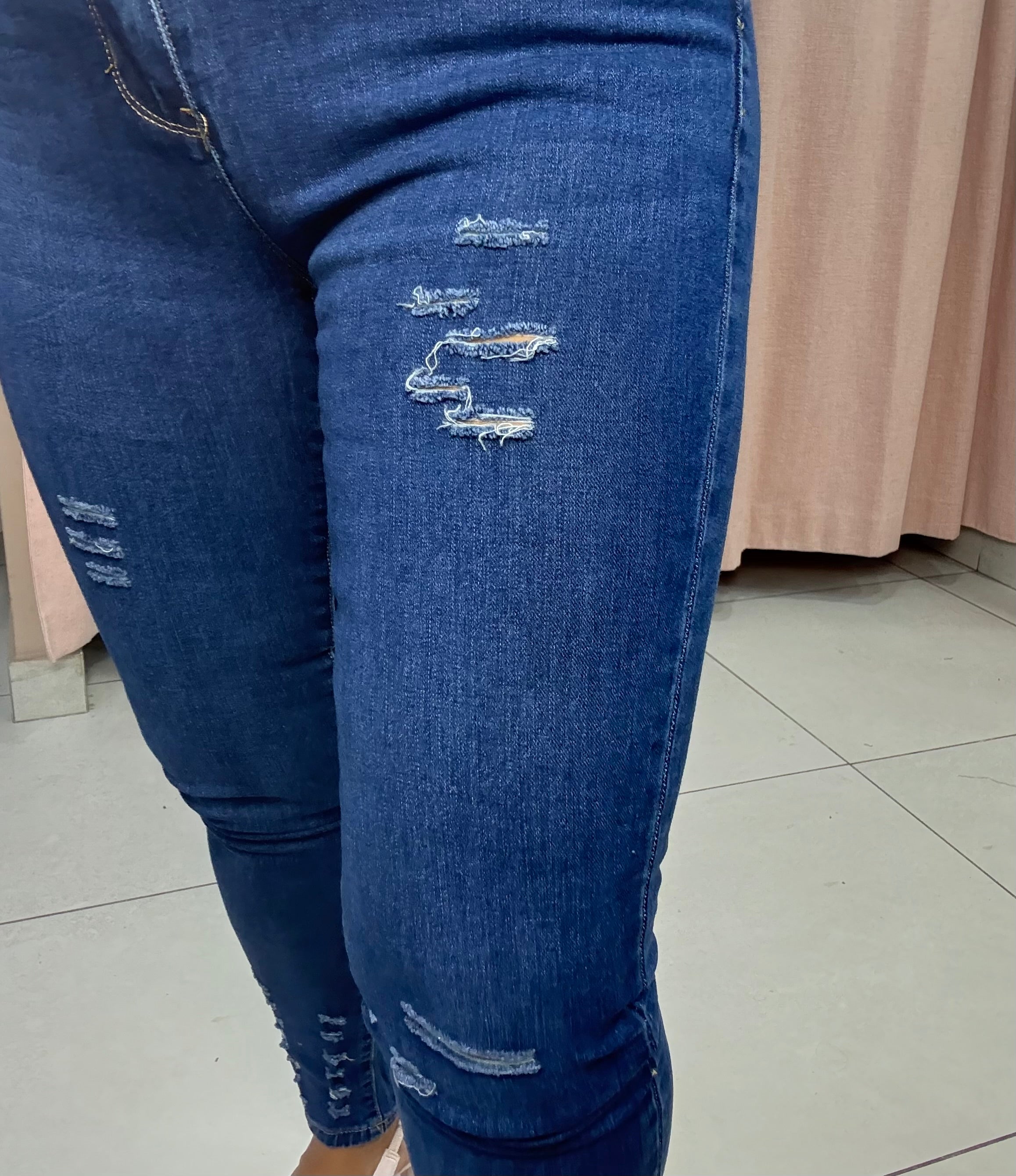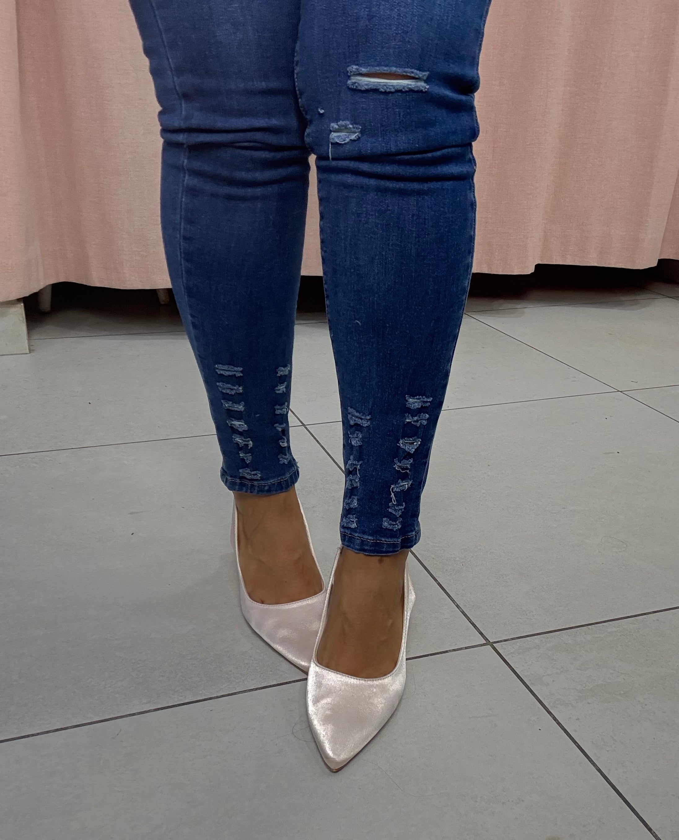 Jeans modello skinny, lavaggio denim scuro con piccole aperture sfrangiate lungo la gamba