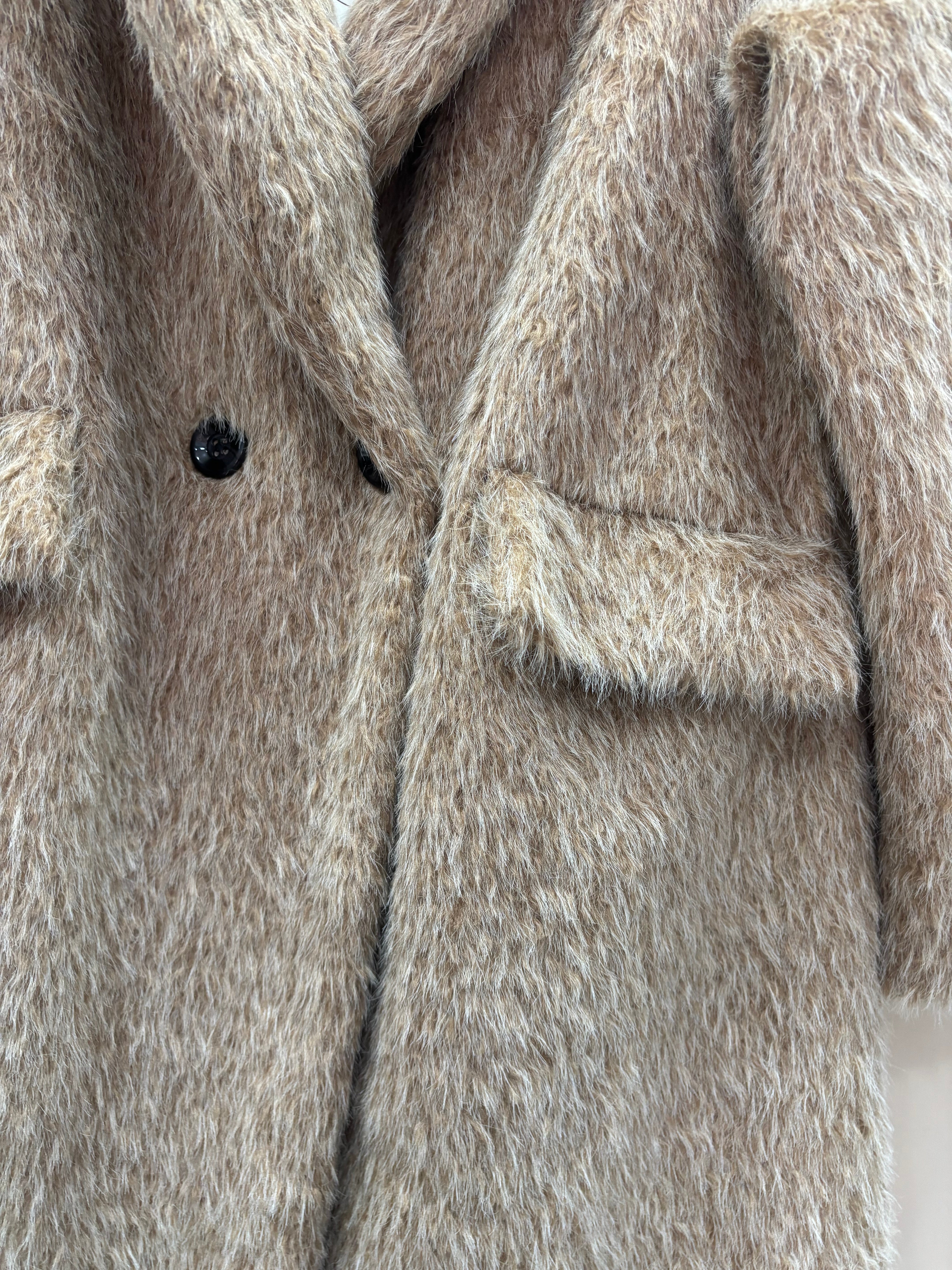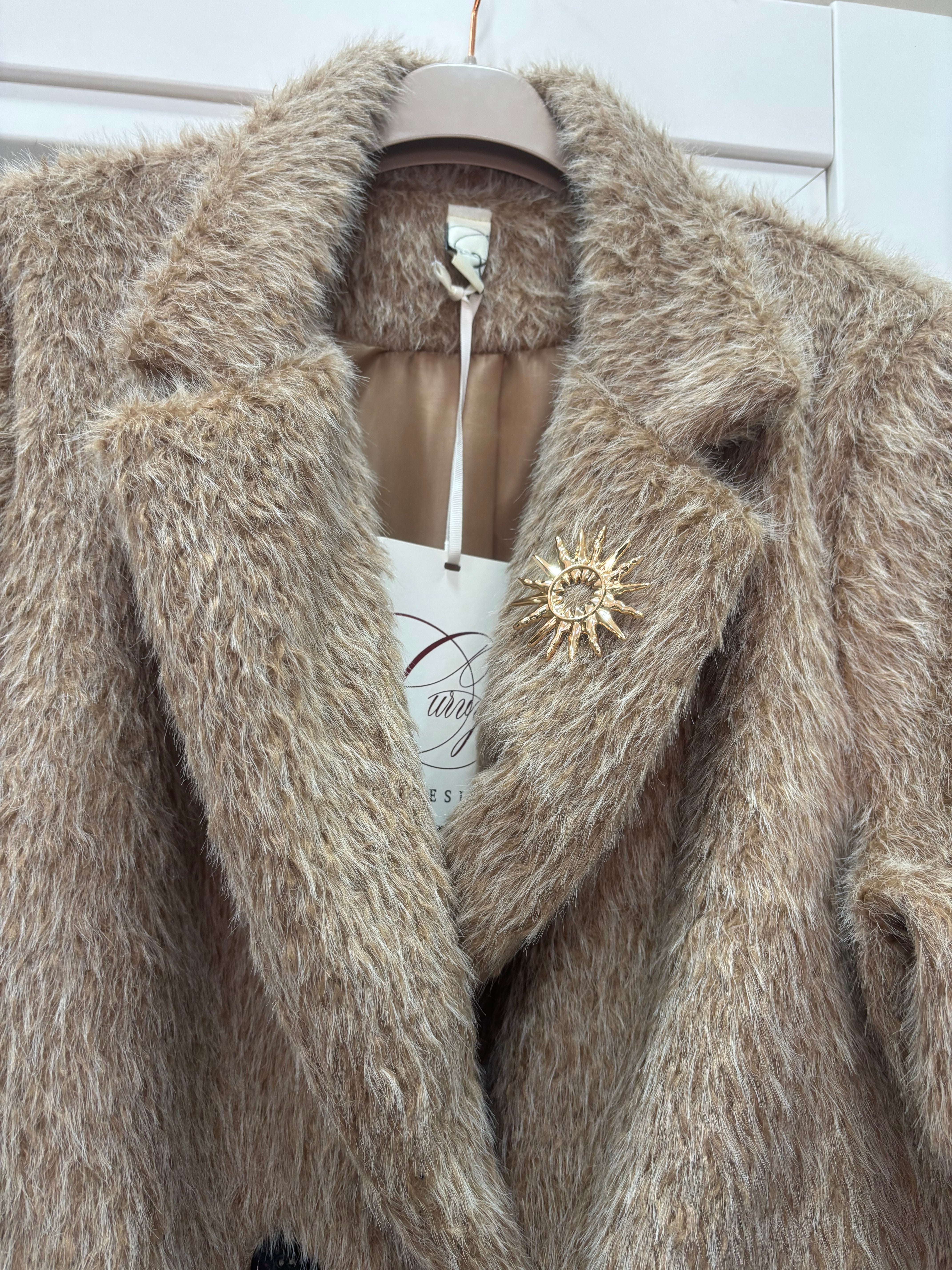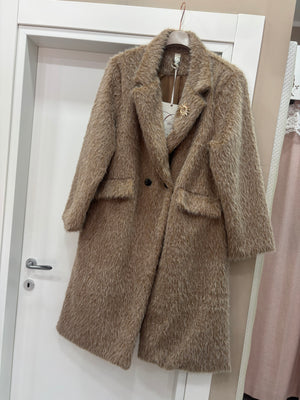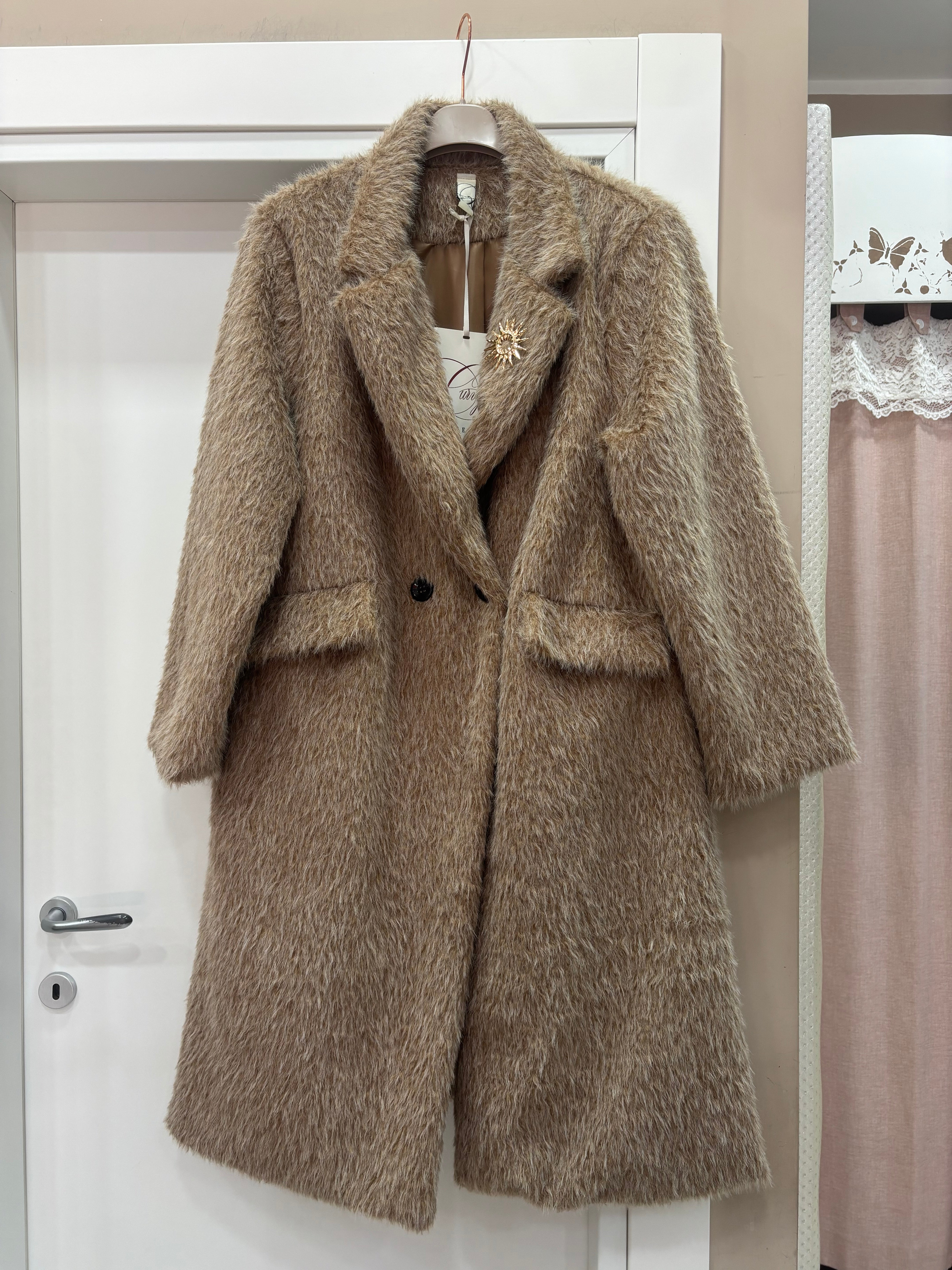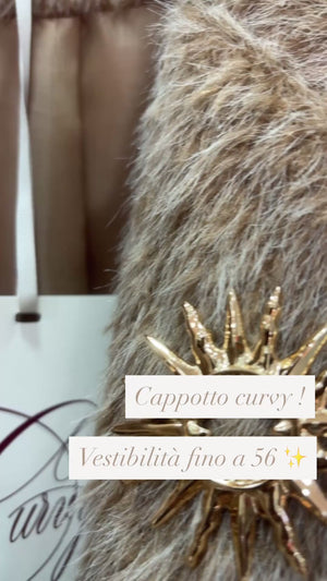Cappotto lungo con pelo in rilievo, modello doppio petto tasche sul davanti aggiunta spilla sul colletto modello oversize, vestibilità fino a taglia 56, foderato all’interno