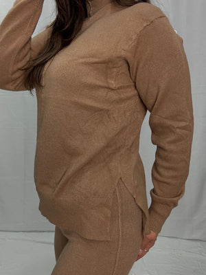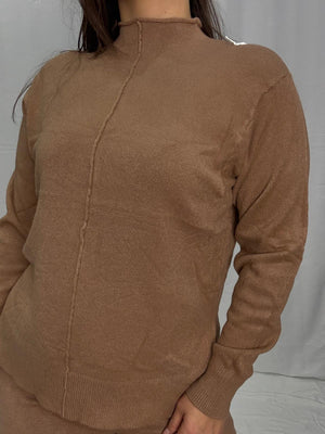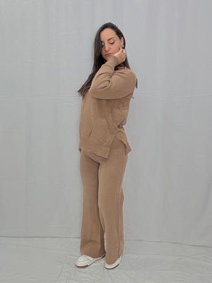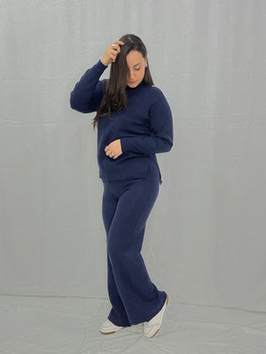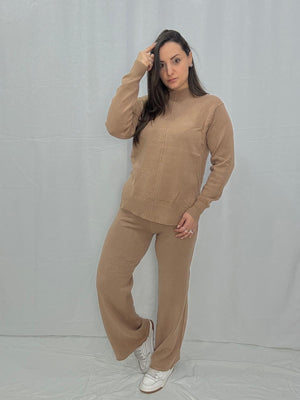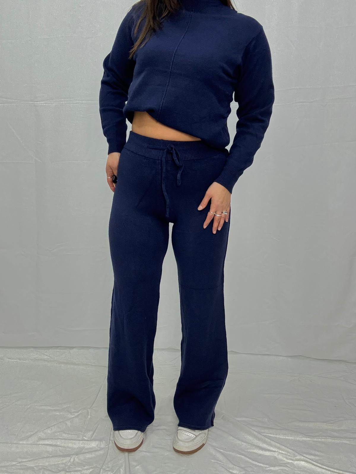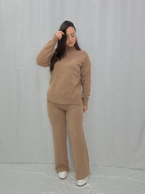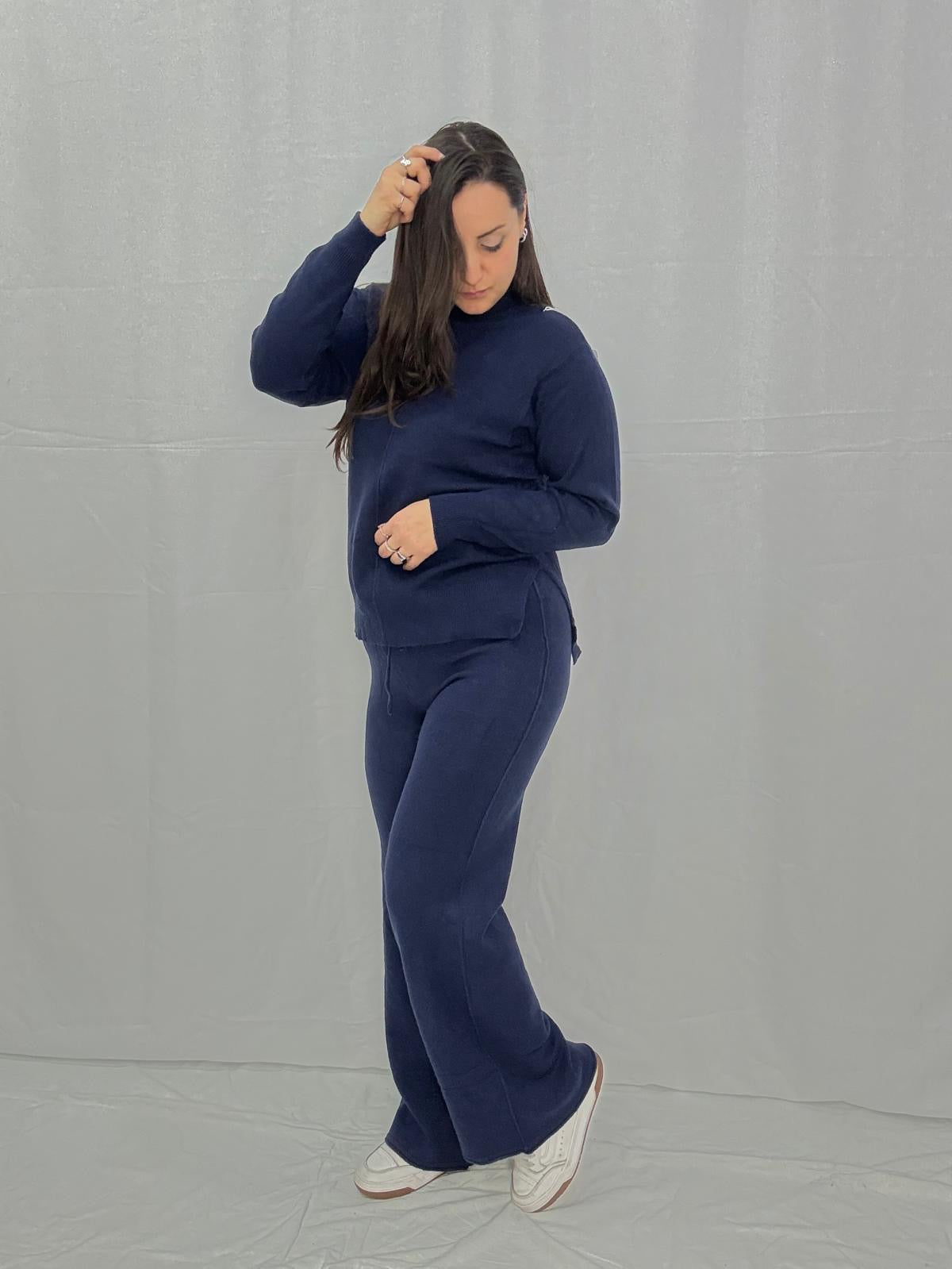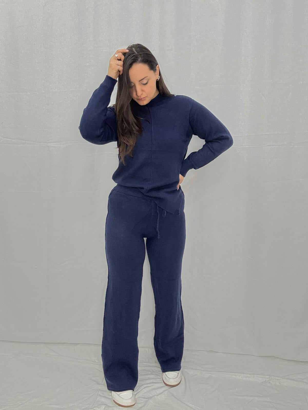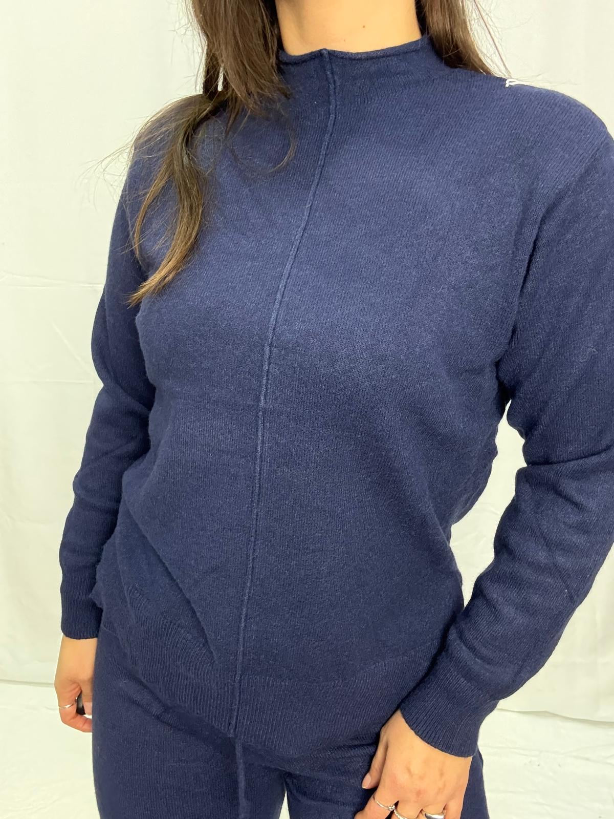 Coordinato in lana rasata, modello molto semplice con leggero mezzo collo e riga in rilievo sulla parte centrale della maglia pantalone con elastico in vita e laccetto regolabile modello palazzo taglia unica, vestibilità da una S fino ad una taglia XL molto elastico