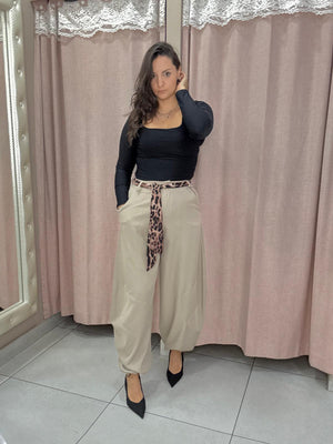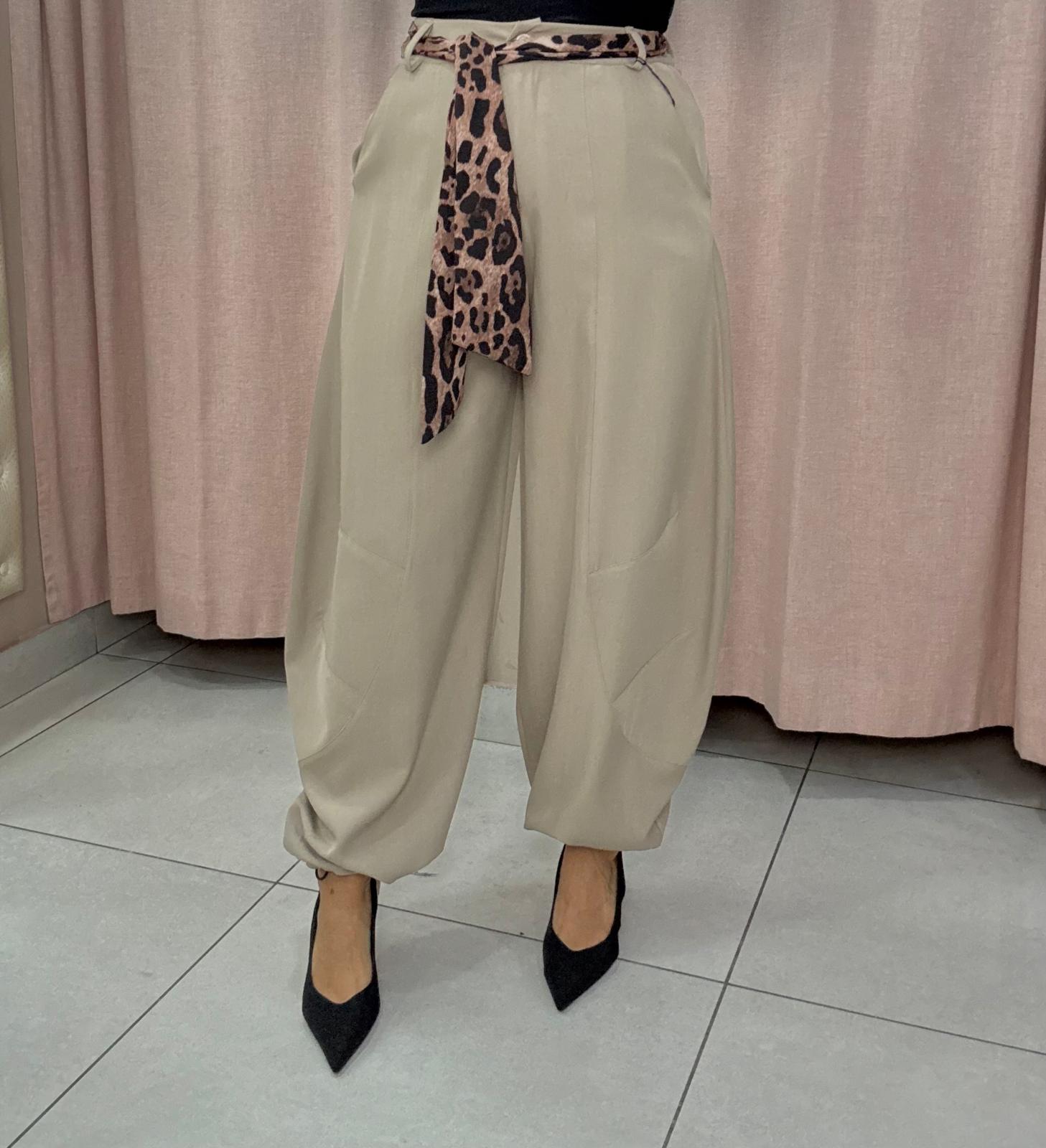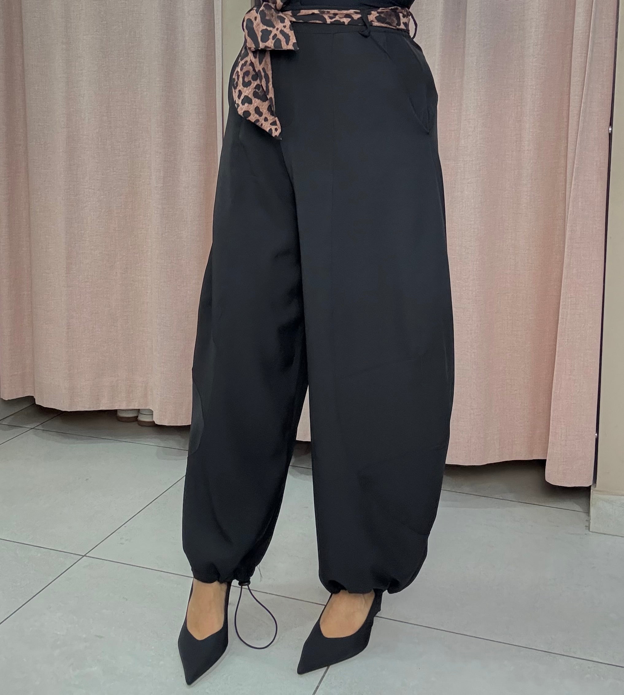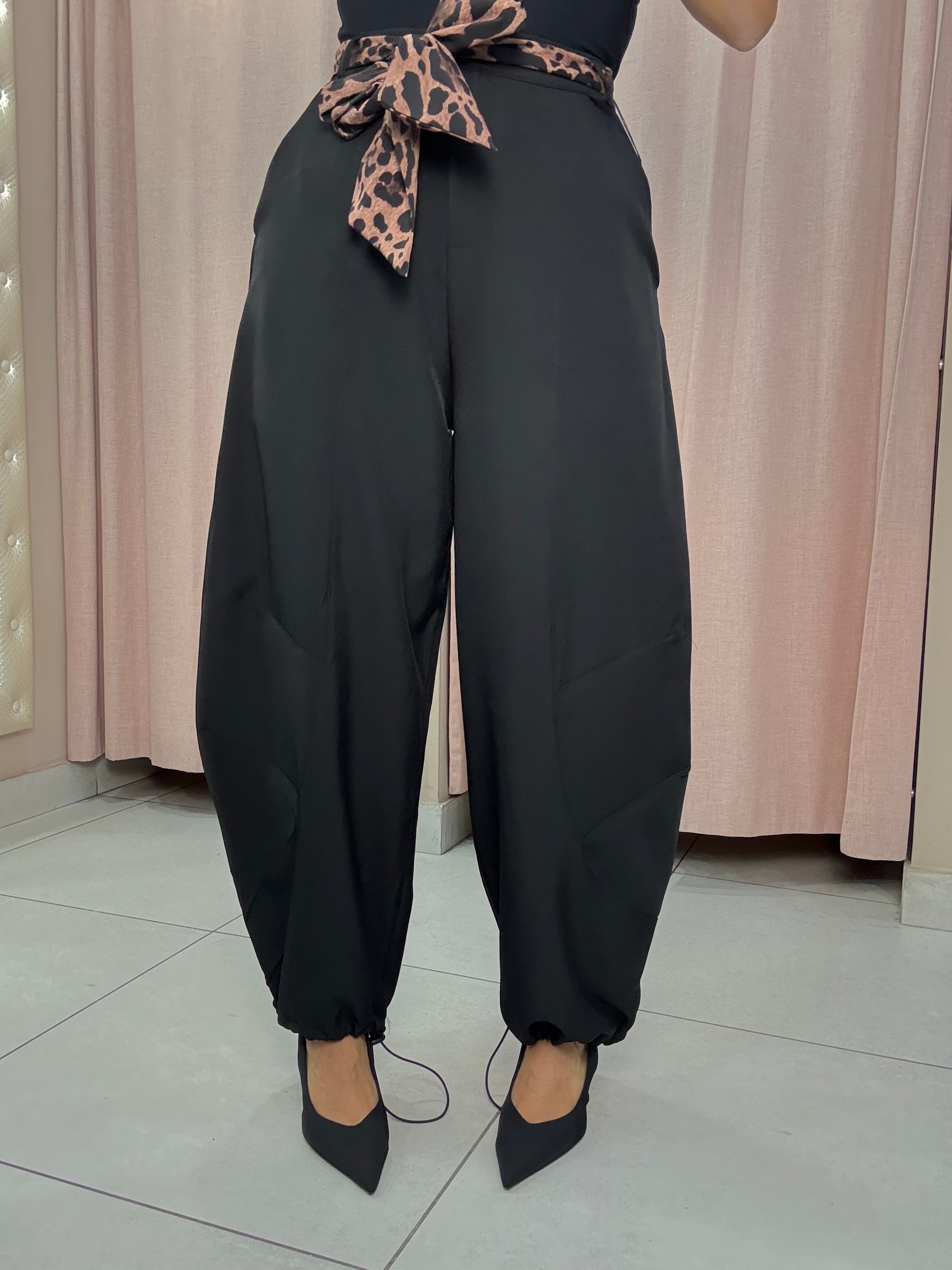 Pantalone in tessuto modello ballon con bustino frontale con zip e bottone ed elastico sul retro