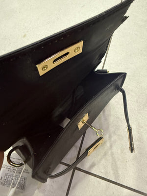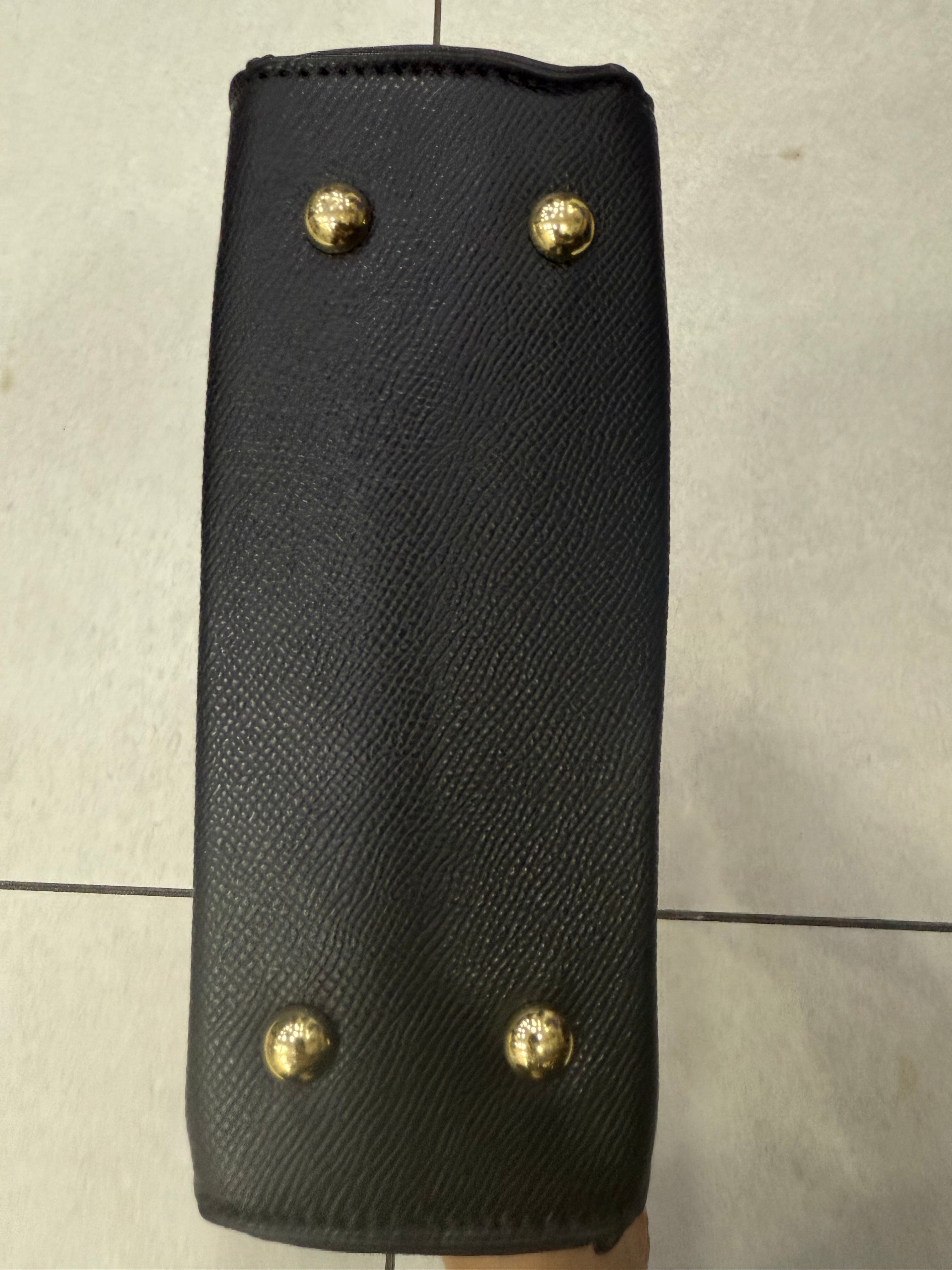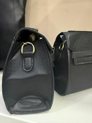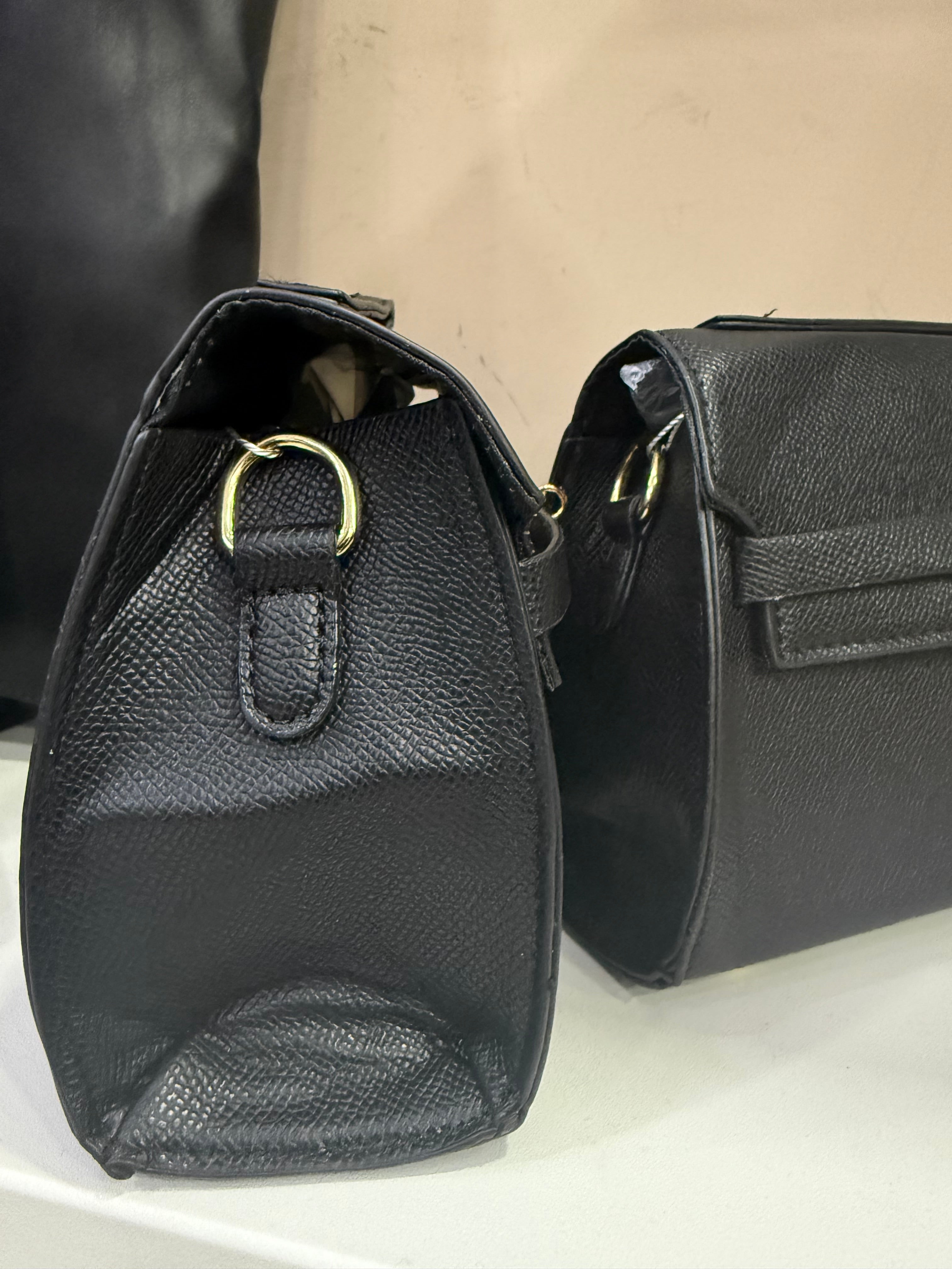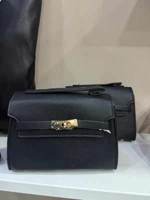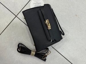 Borsetta in simil pelle di piccole dimensioni, con manico rigido, tracolla regolabile, chiusura a gancio frontale