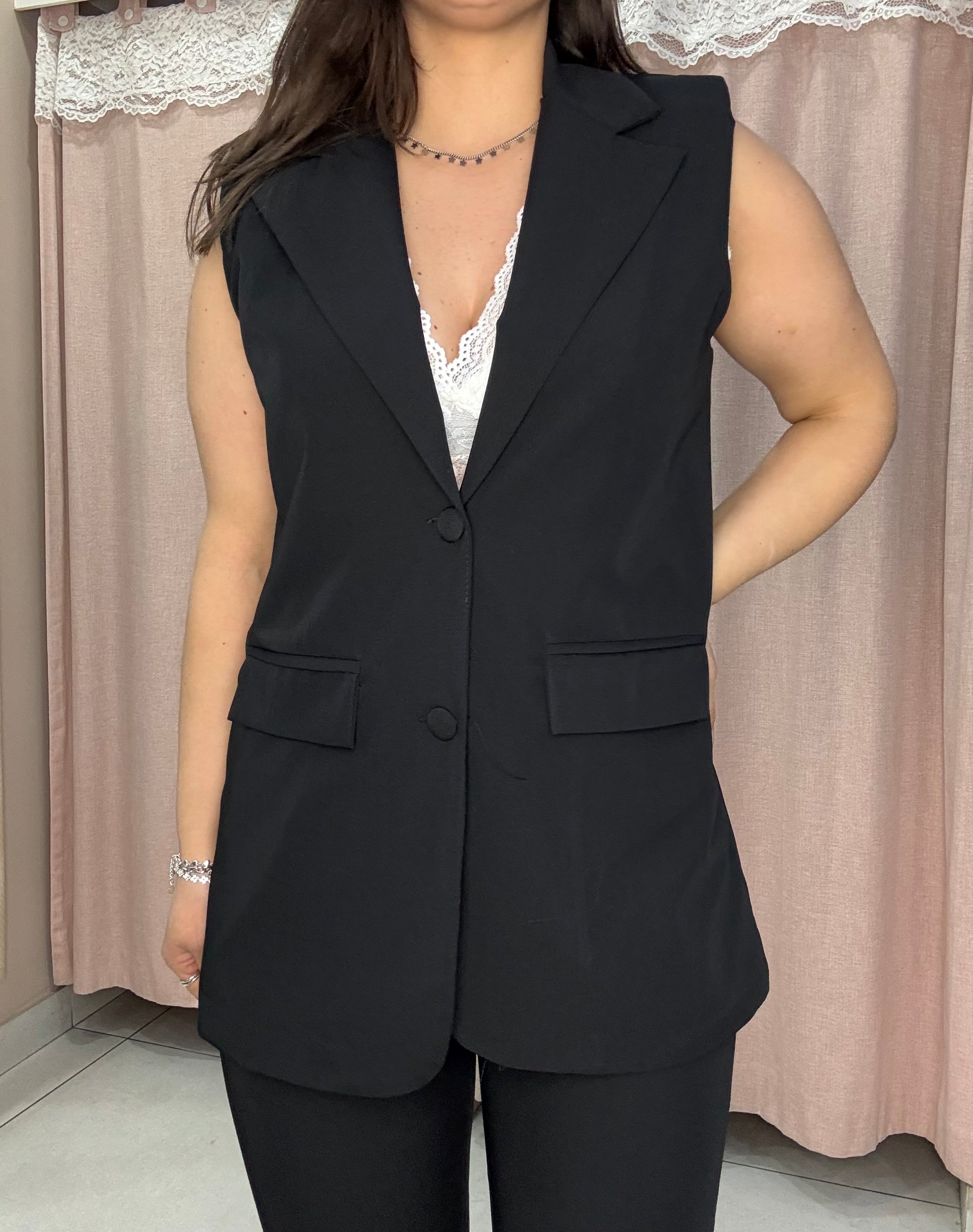 Tailleur classico composto da gilet lungo foderato con bottoni frontali in tessuto, spalline imbottite e fusciacca regolabile in vita, finte tasche laterali