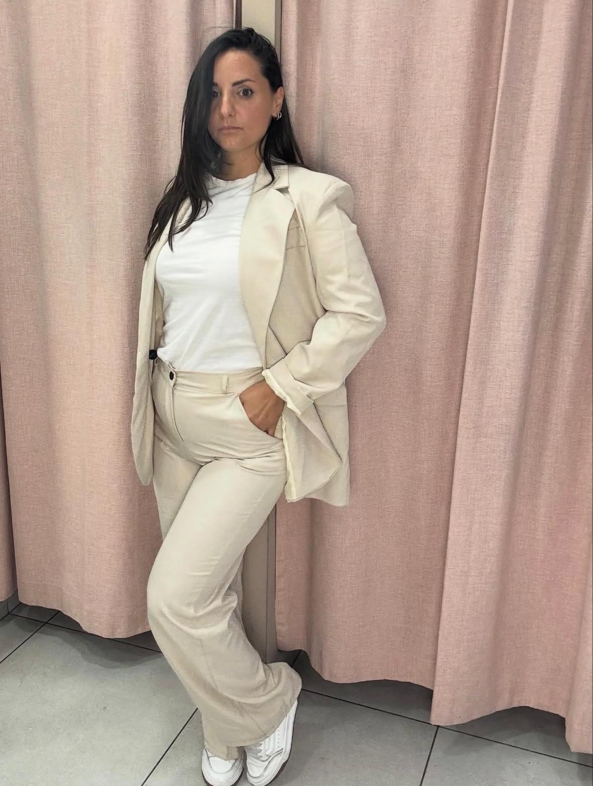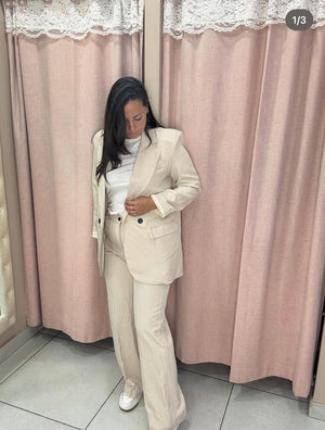 composto da giacca over con bottoni frontali a contrasto, pantalone con bustino frontale ed elastico sul retro