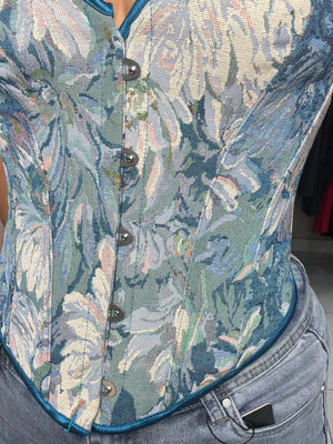 Corsetto fantasia floreale con stecche rigide e chiusura a gancio frontale, scollo a cuore