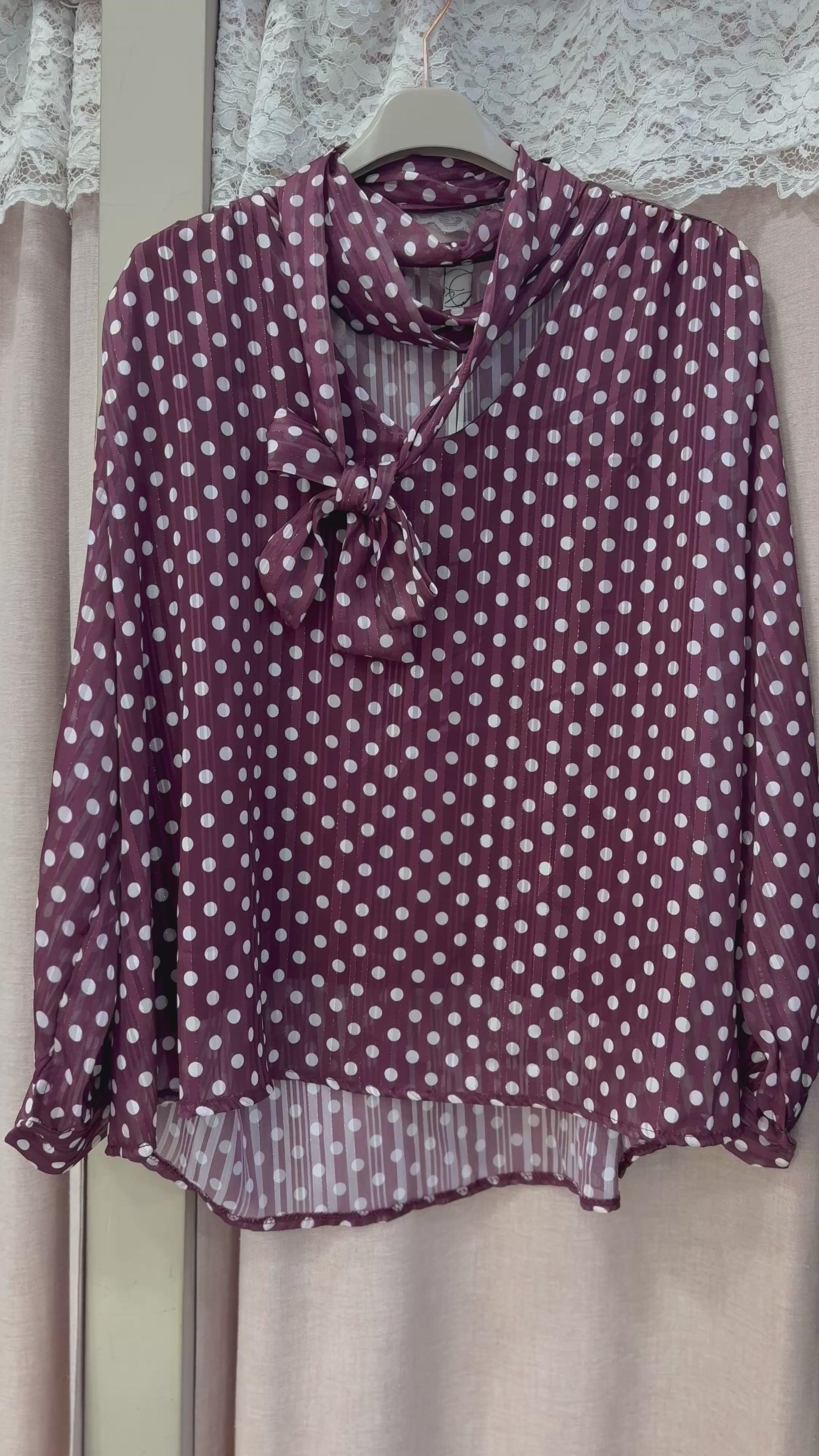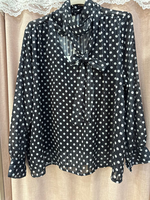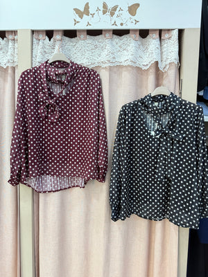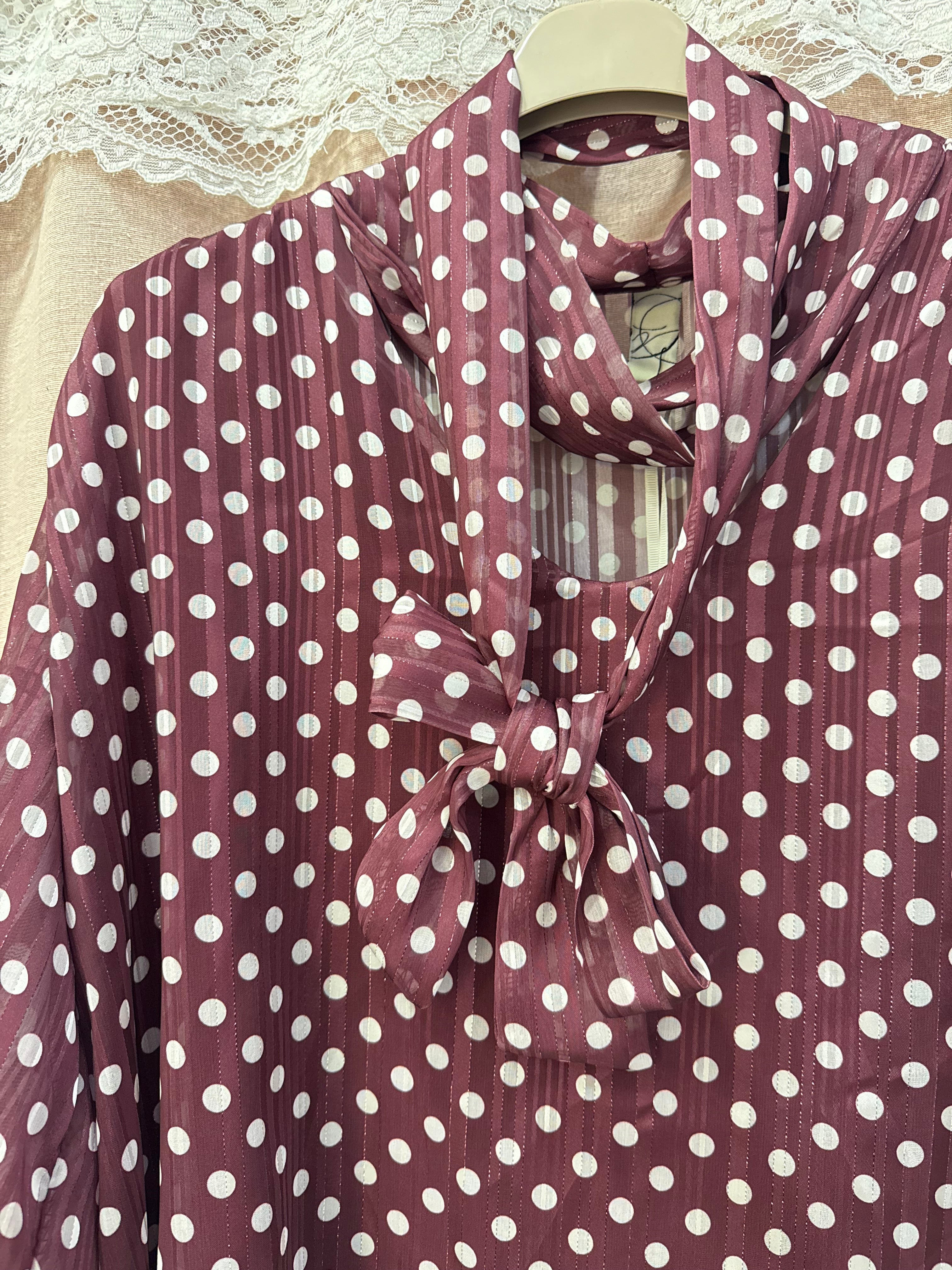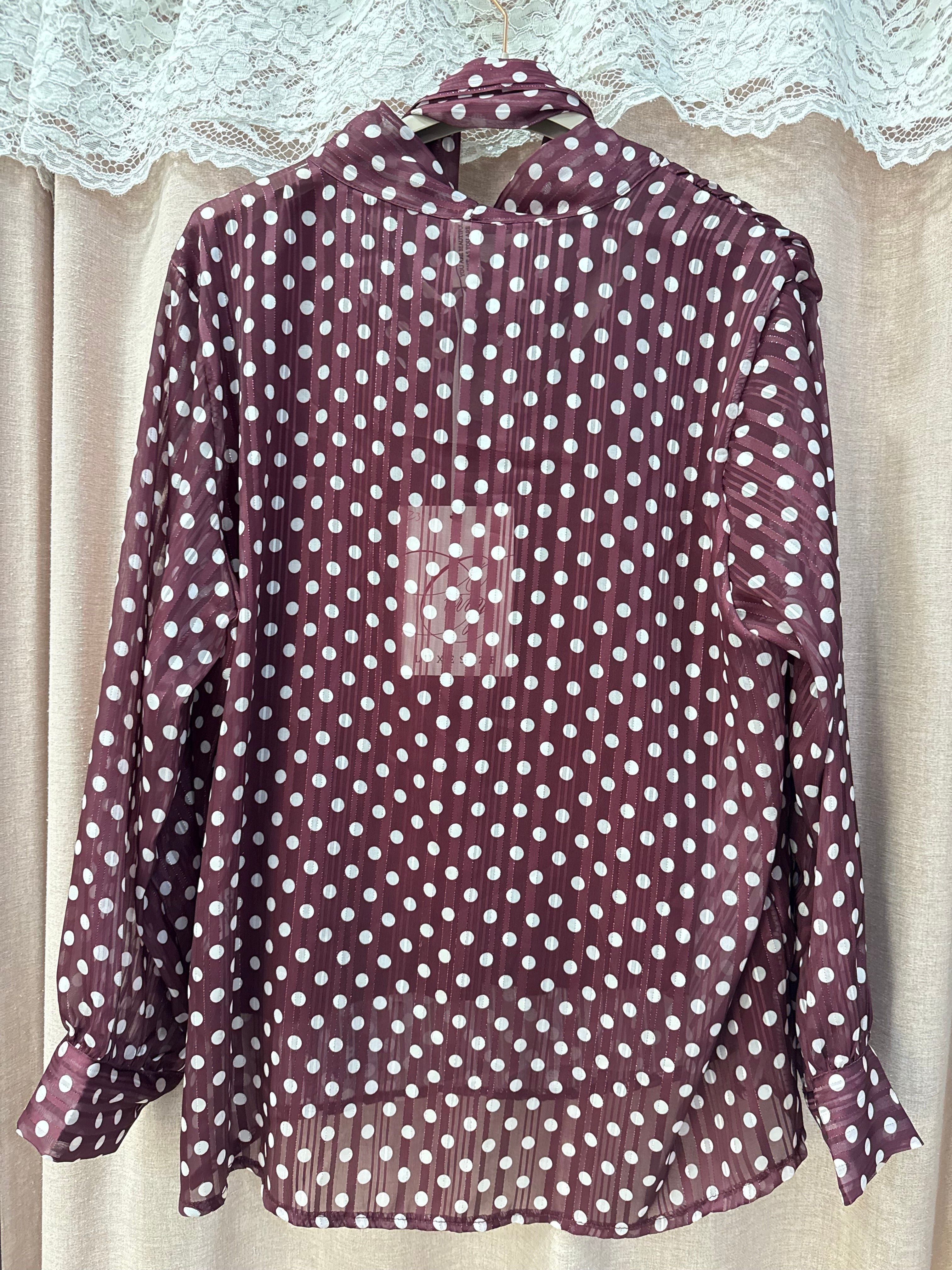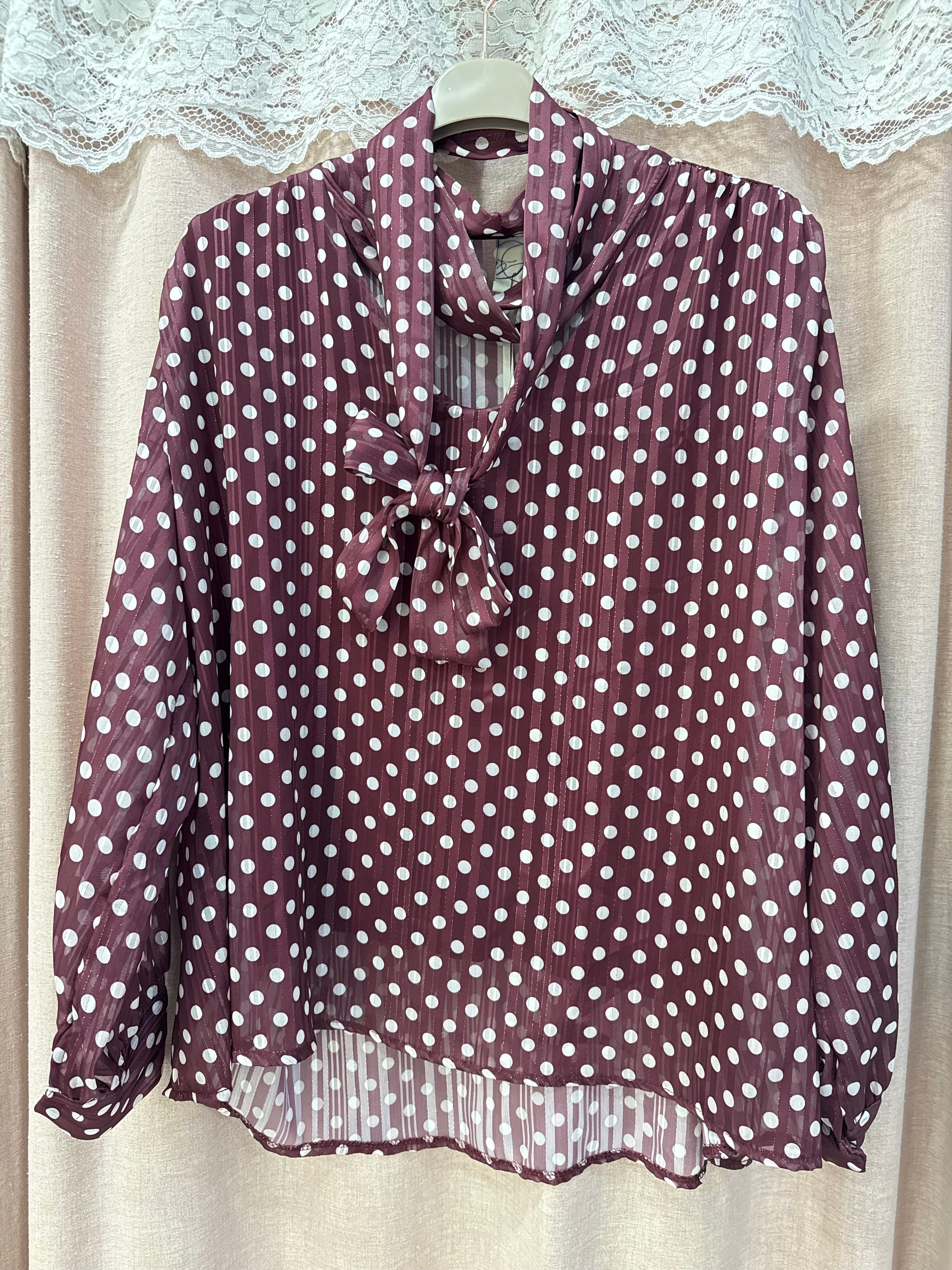 blusa velata fantasia pois con foulard al giro collo regolabile, fili laminato all’interno