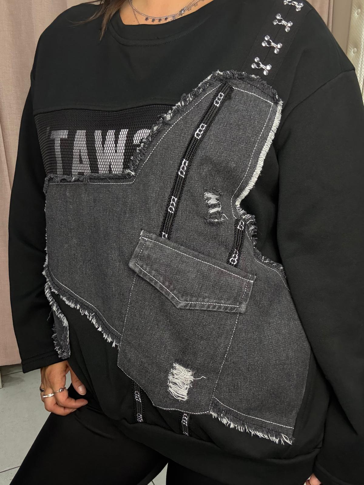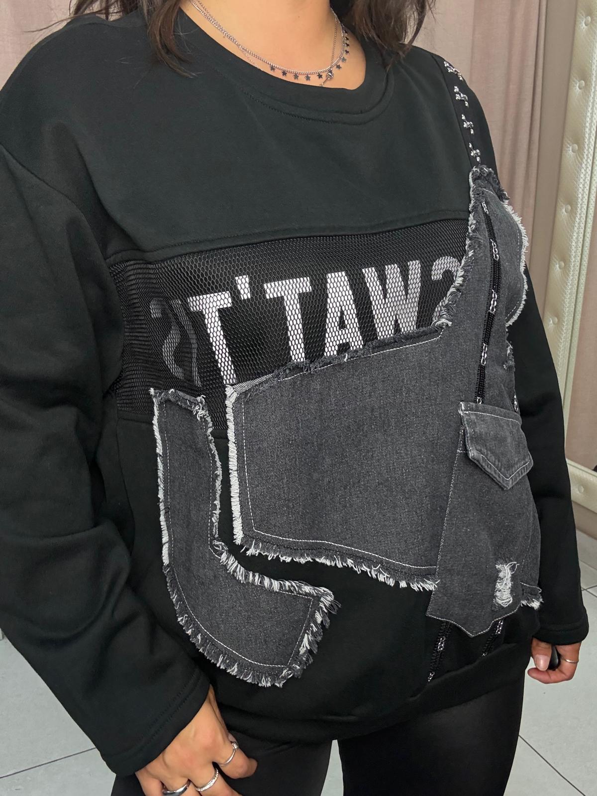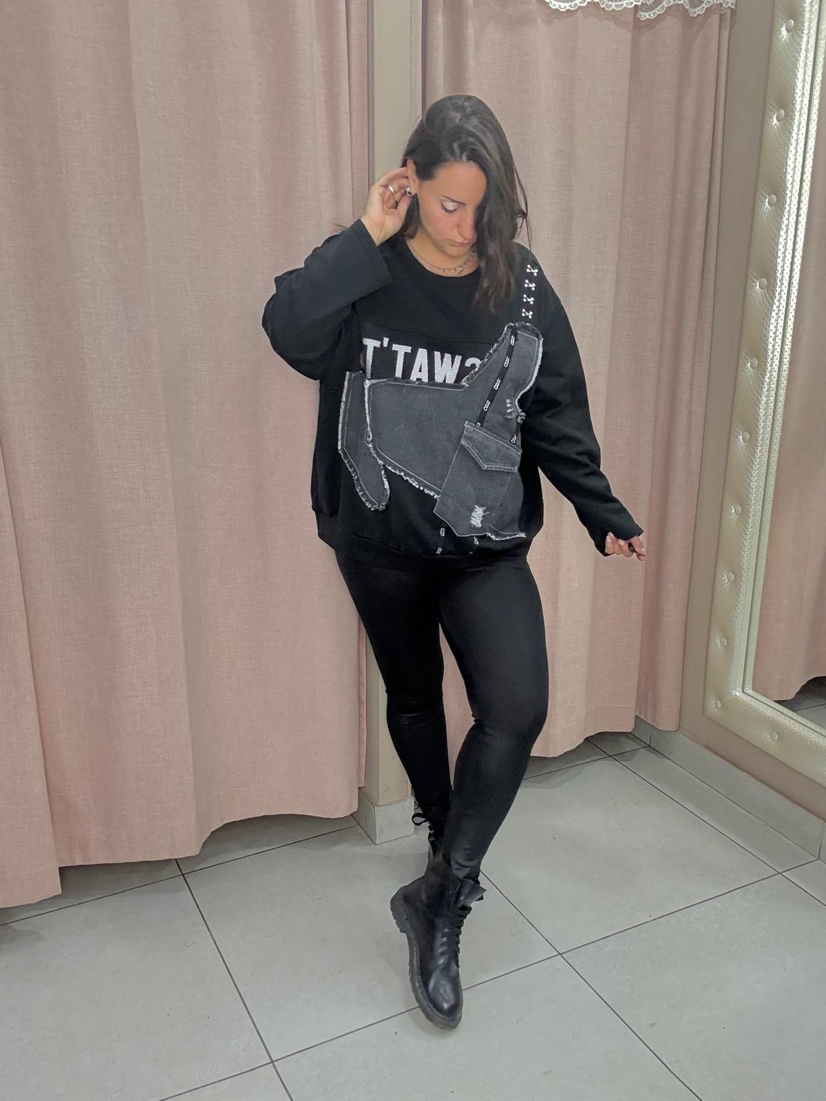 Felpa in 100% cotone con inserti in Denim grigio e stampe, modello oversize