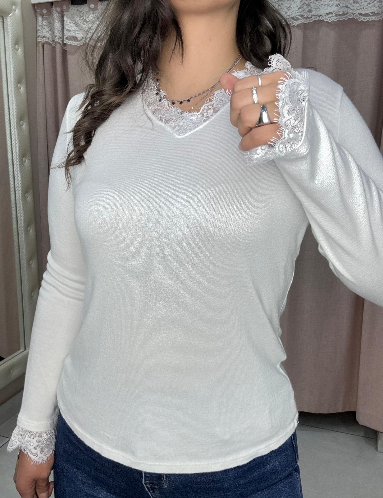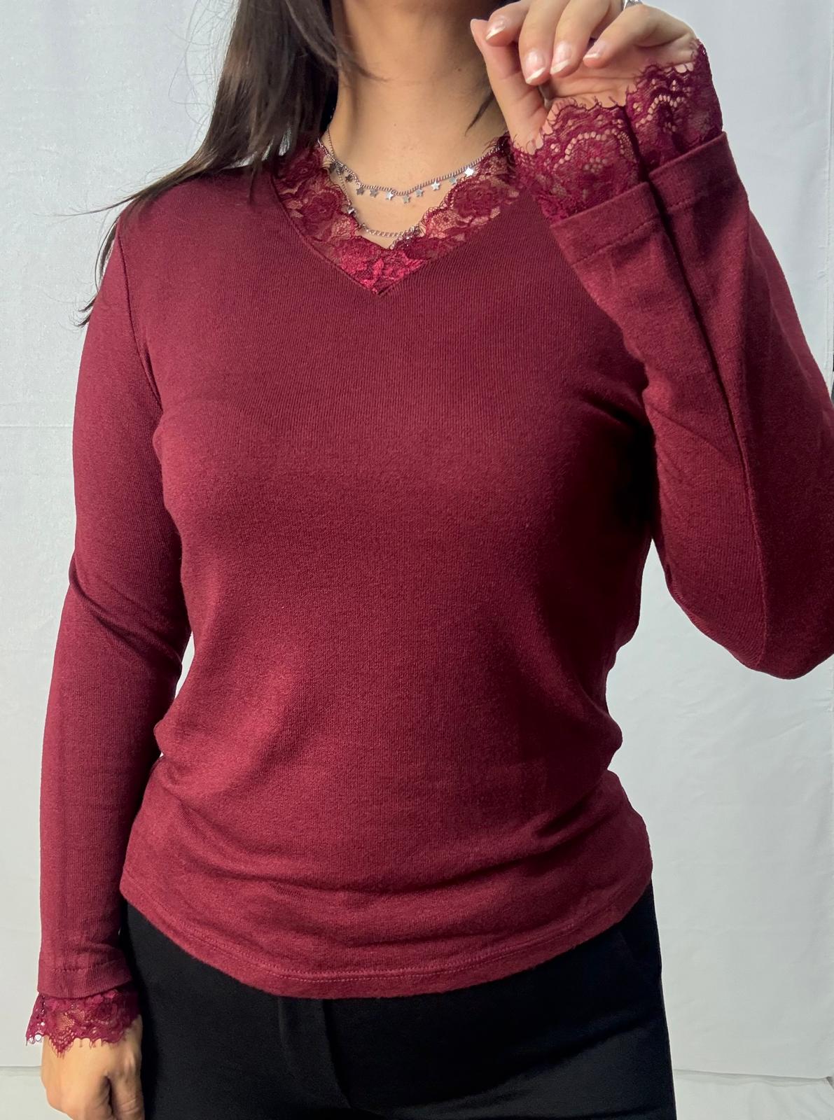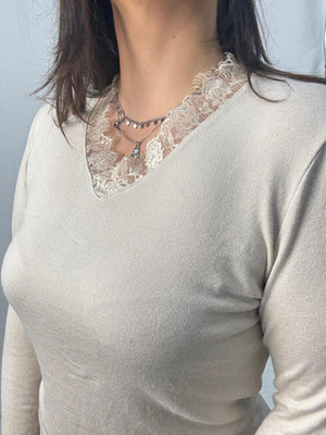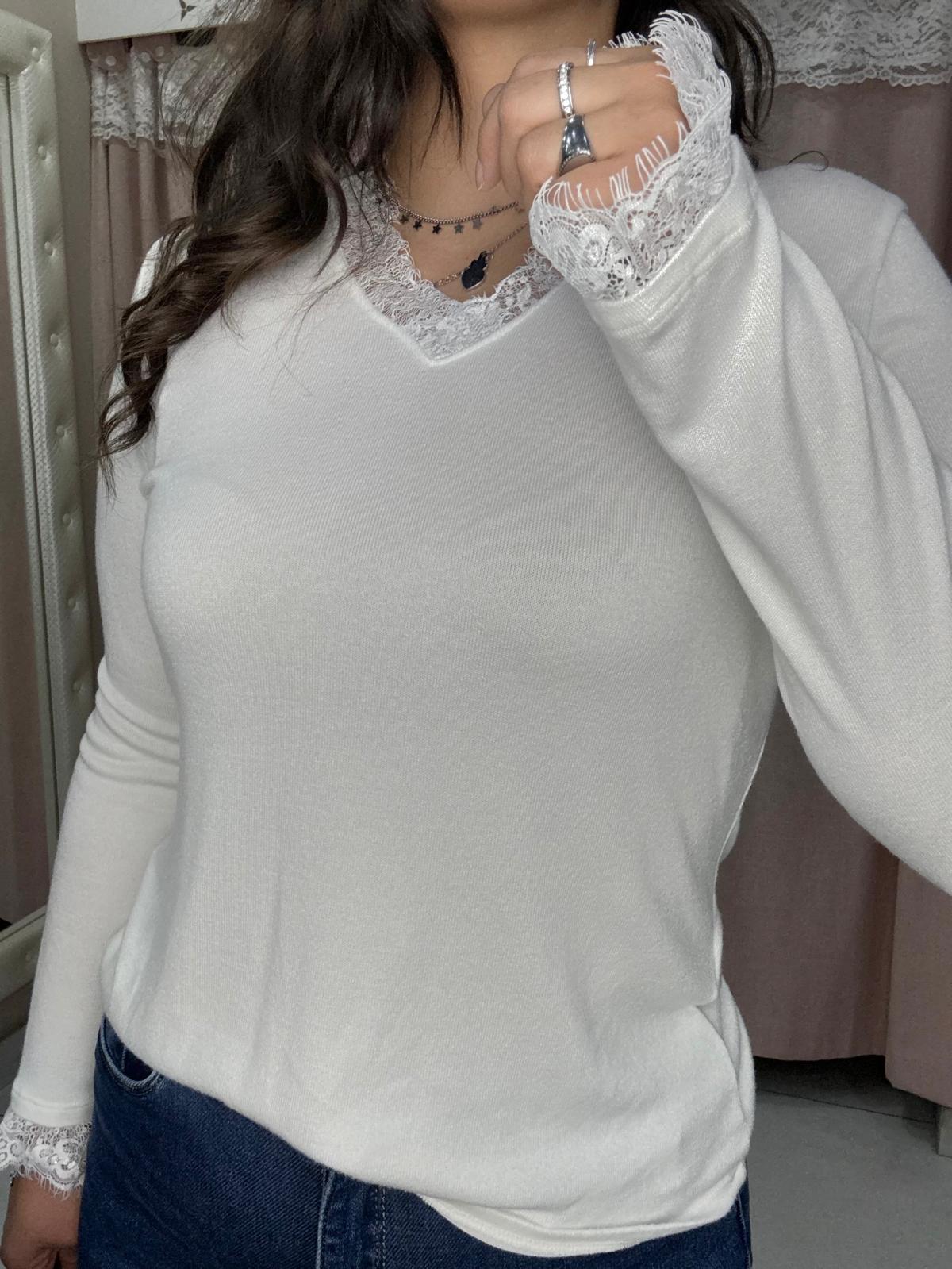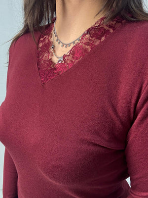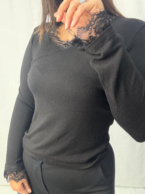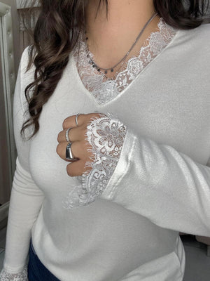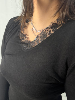 Maglia in lana rasata, scollo a V con dettagli in pizzo al collo e ai polsi