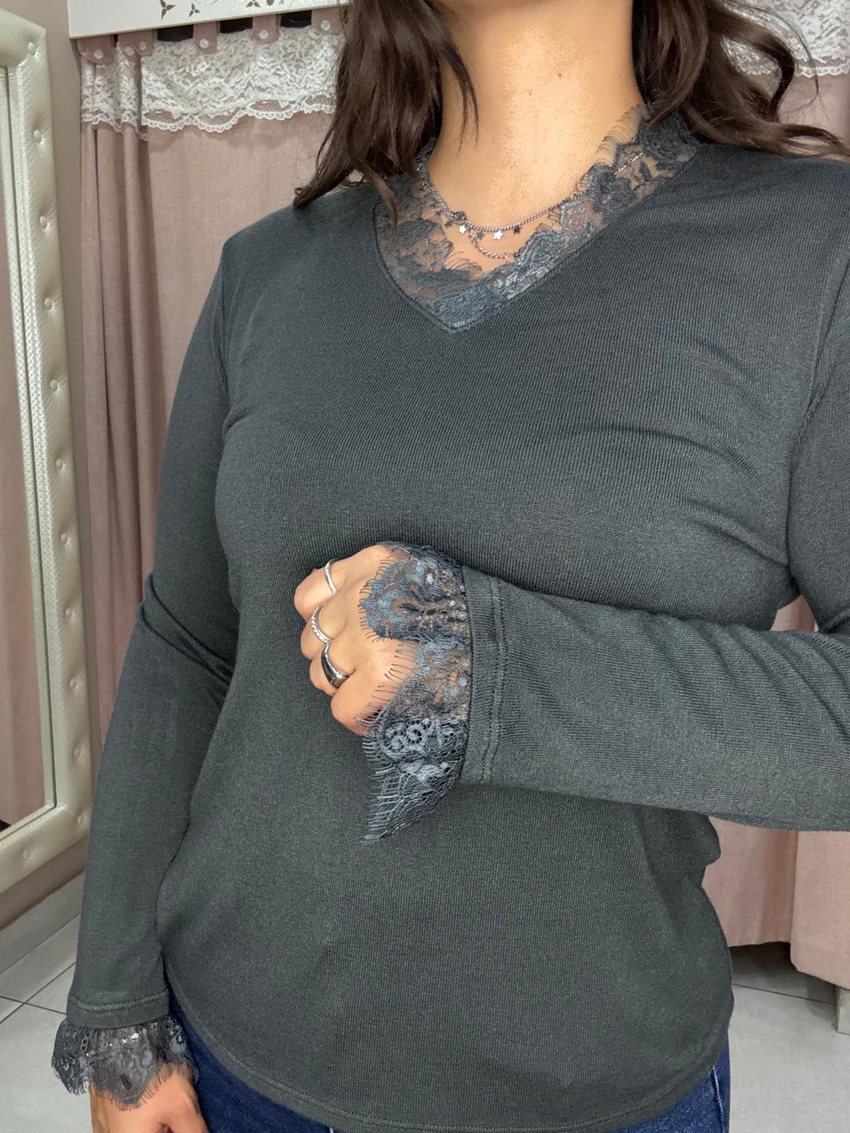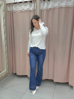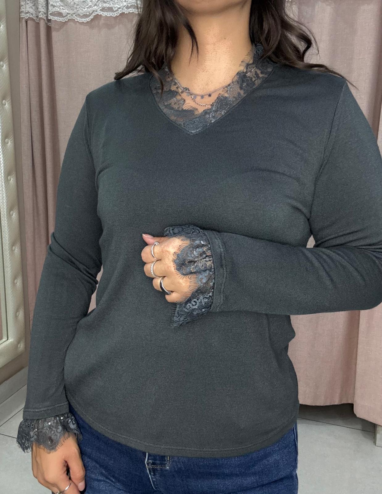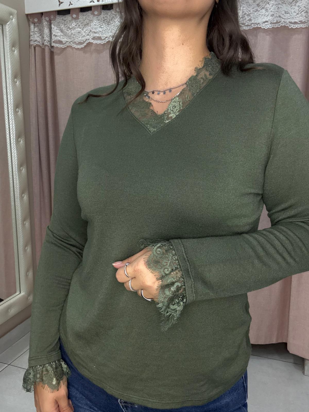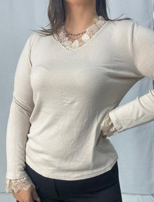 Maglia in lana rasata, scollo a V con dettagli in pizzo al collo e ai polsi
